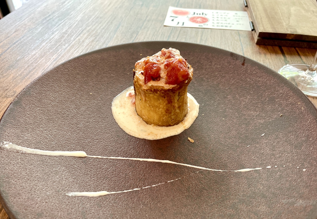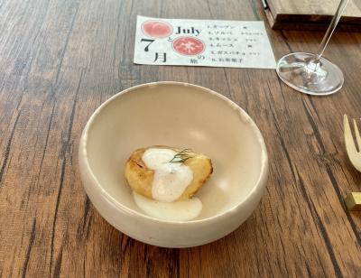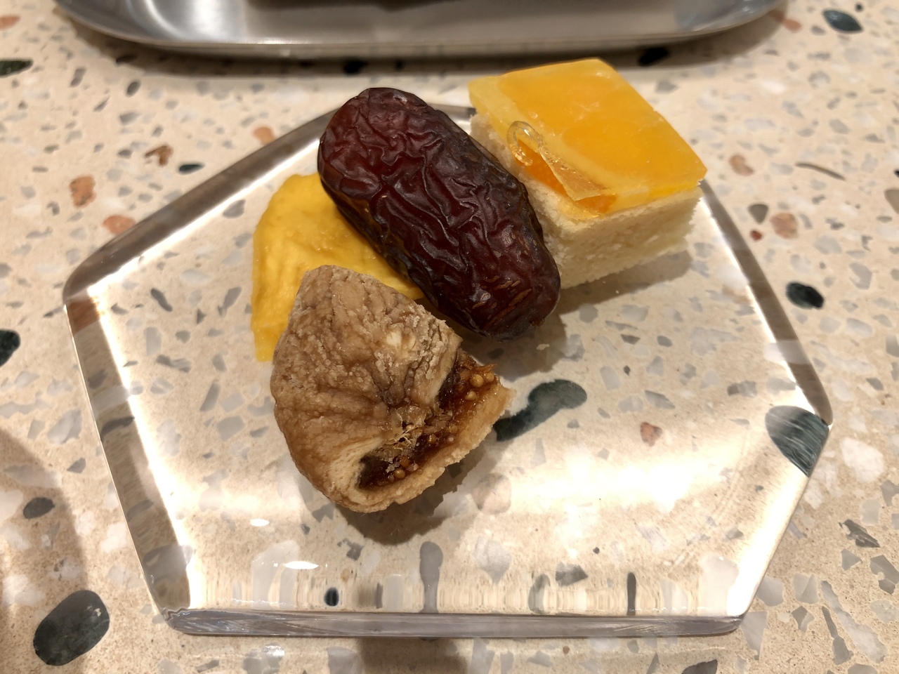 一品目はオリエンタルなアレンジの効いたサワークリームが添えられた焼き桃。