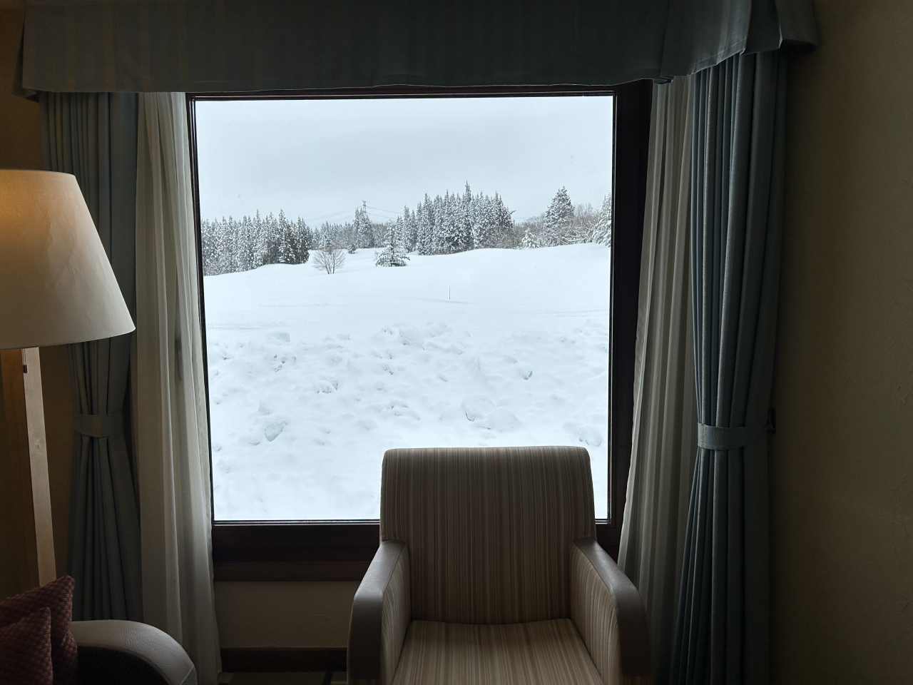 今回2度目の来訪をしました。夏はゴルフ場併設で部屋からは美しい緑が、冬は真っ白な雪景色を眺めることができます。もちろん今回は一面の雪景色です。