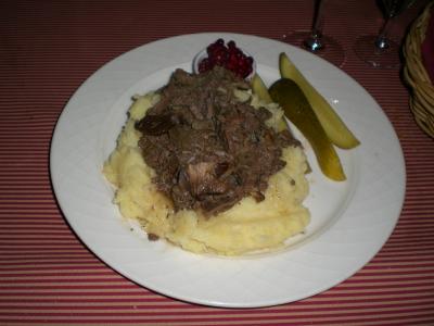 ラップランド料理のトナカイの煮込み・ブレッドチーズのベリーアングレーズソースがけは逸品でした。写真はトナカイの煮込み+マッシュポテトです。臭みもスパイスで抑えてあり、パンも美味でおいしかった♪