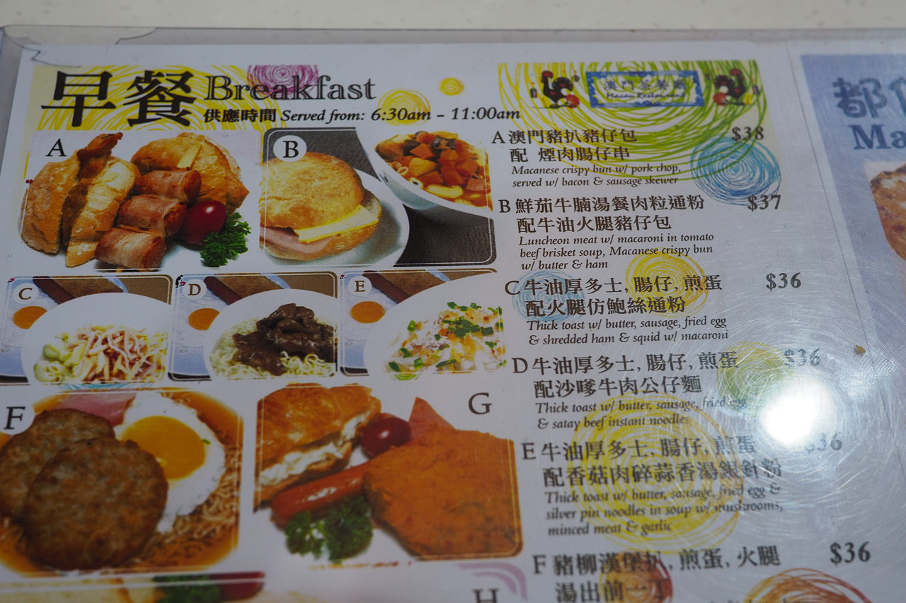 モーニングのメニューは9種類ほどありどれも写真付きで注文しやすかったです。パン系、お粥、麺系色々ありました。パンとミネストローネのようなメニューにしましたが普通に美味しかったです。ミルクティーは甘めでこの旅で一番美味しく感じました。エッグタルトはテイクアウトにして九龍公園で食べました。パイ生地にクリームはトロトロで美味しかったです。店内では9HKD、テイクアウトだと10HKD。店員はそっけないカタコト英語での対応で怖かったですが、香港っぽい雰囲気でそれもまたよしでした。店内ではエッグタルトだけの注文は不可と店前に書いてありました。食べたかったピーナッツパンはモーニングの時間だったからか注文できませんでした。- 旅行時期