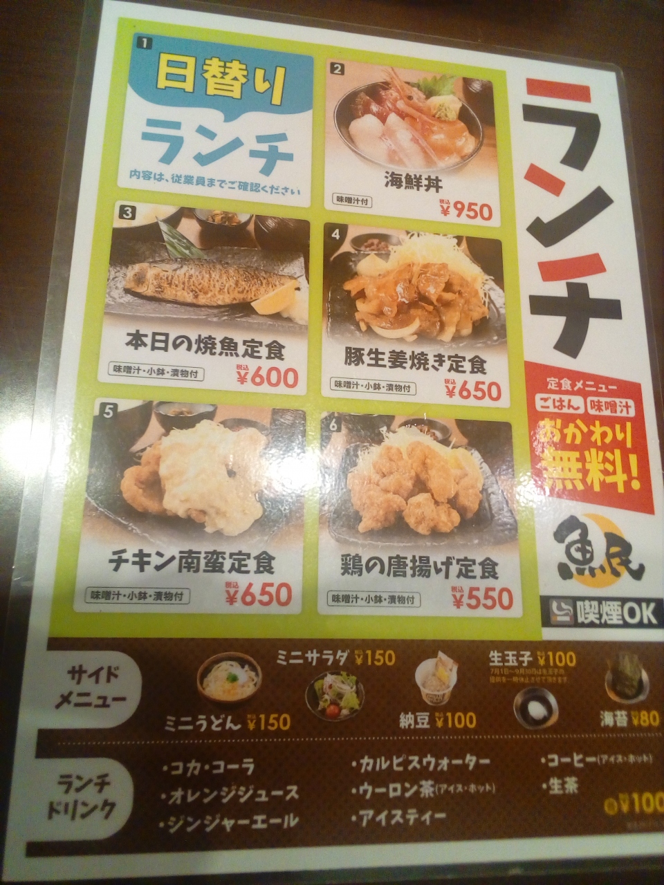 地下鉄小川町の駅前にあるチェーンの居酒屋さんですが、私はランチで利用しました。600円代から定食を食べられ、ご飯とお味噌汁はお替り自由でコストパフォーマンスはとてもよいです。お味はまあ普通ですが、こういう安上がりでお昼が食べられる場所は貴重です。