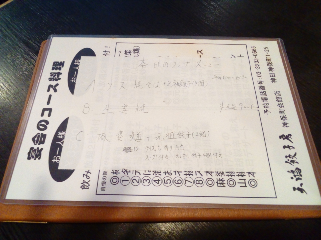 神保町駅から歩いて数分のところにあります。ランチタイムには900円で3種類の定食メニューがあり、私は豚肉生姜焼き定食をいただきました。これに餃子が4つ付きます。売り物の餃子がおいしいのは当たり前ですが、豚肉生姜焼きもなかなかおいしくご飯が進みました。