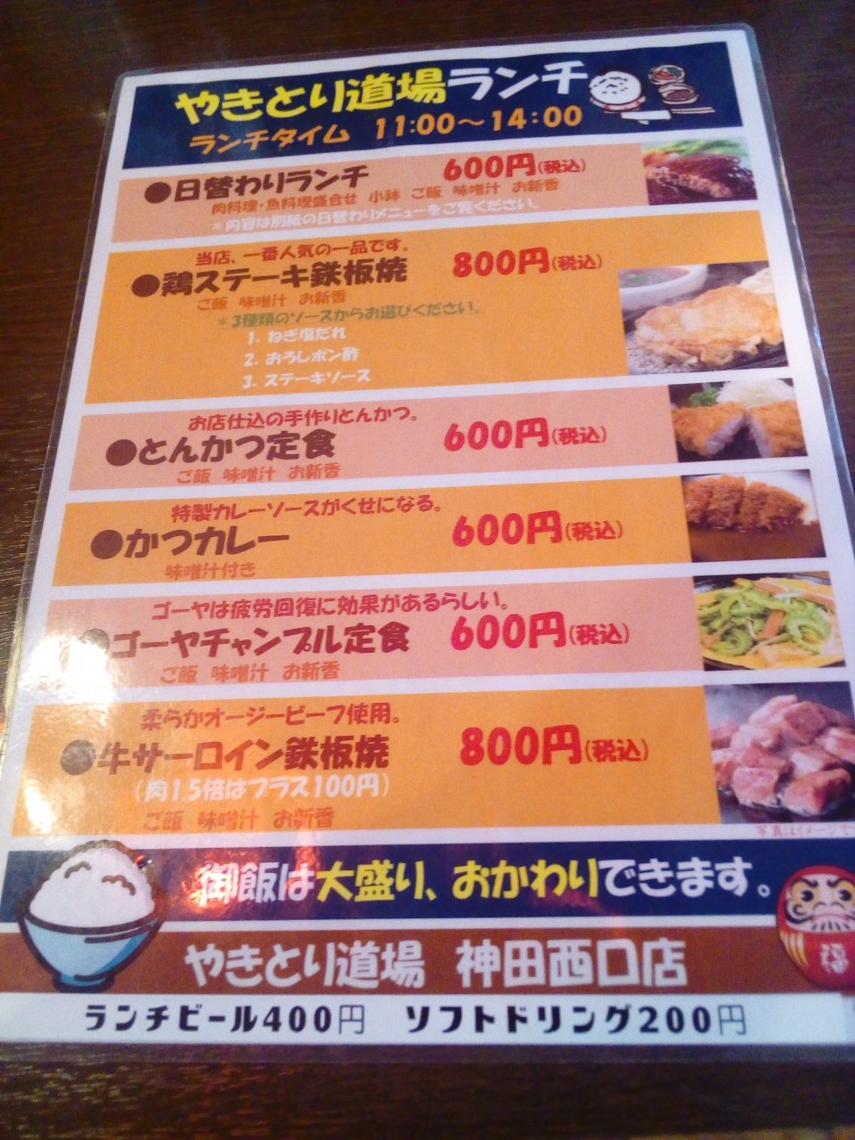 神田駅から歩いて5分くらい、神田西口商店街の中にあります。となりが松屋なのでわかりやすいです。日替わりが600円なのに、鶏の揚げ物ソースかけとソーセージ、サラダ、スープ、ご飯がついていました。これで文句を言ったら罰があたります。