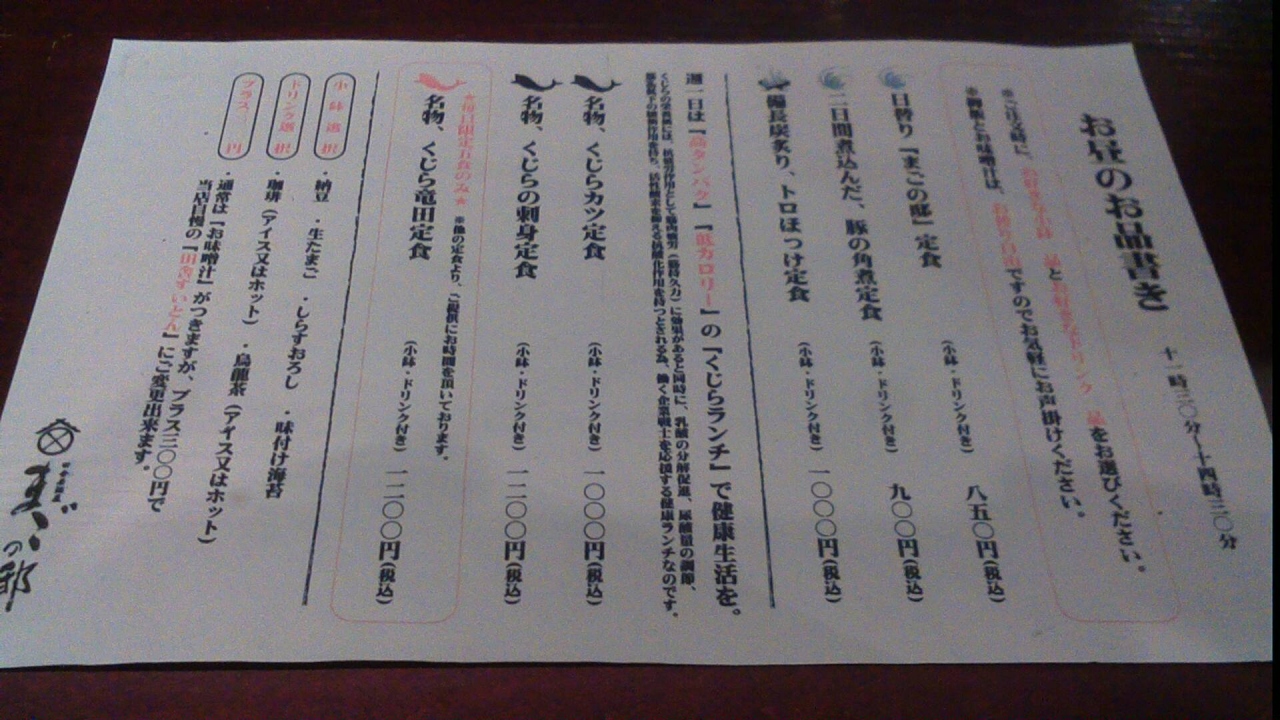 赤坂見附駅から徒歩5分くらいです。ここの特色は普通の定食に加えてくじらが食べられることです。くじらかつ定食やクジラの竜田揚げ定食が1000円前後で食べられます。一つ残念なのは、タバコが自由なことです。まあ、それがメリットと考える人もいるのでしょうが。