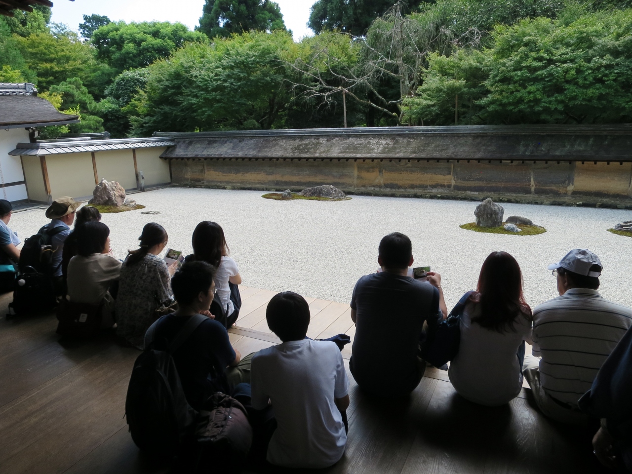 龍安寺の石庭と言えば、徹底的に抽象化された日本庭園の典型と言ってもいい存在なのだと思います。私には、この白砂や石の配置が何を意味するのか見当もつきませんが、それでも、この不思議な雰囲気を他の観光客と一体になって眺めるのは得難い経験でした。
