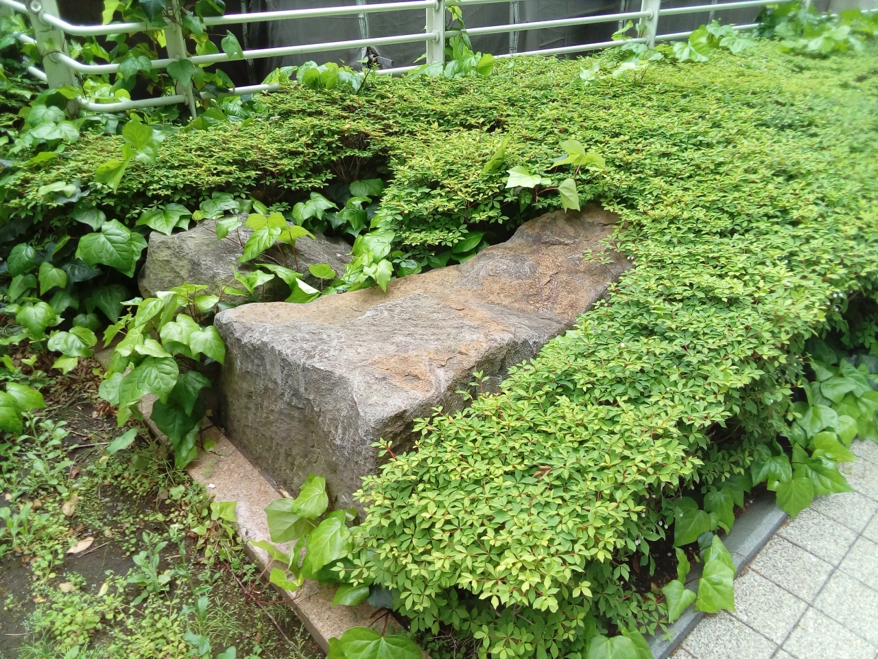 地下鉄大手町駅からすぐの大手町フィナンシャルシティ北側に神田川に沿って広場がありますが、そこにポツンと掲示と一緒にあります。あるものは写真のとおりで、注意しておかないと見逃すこと間違いなしです。江戸時代の遺跡と近代的なビジネス街との共存、これが大手町なのでしょうね。