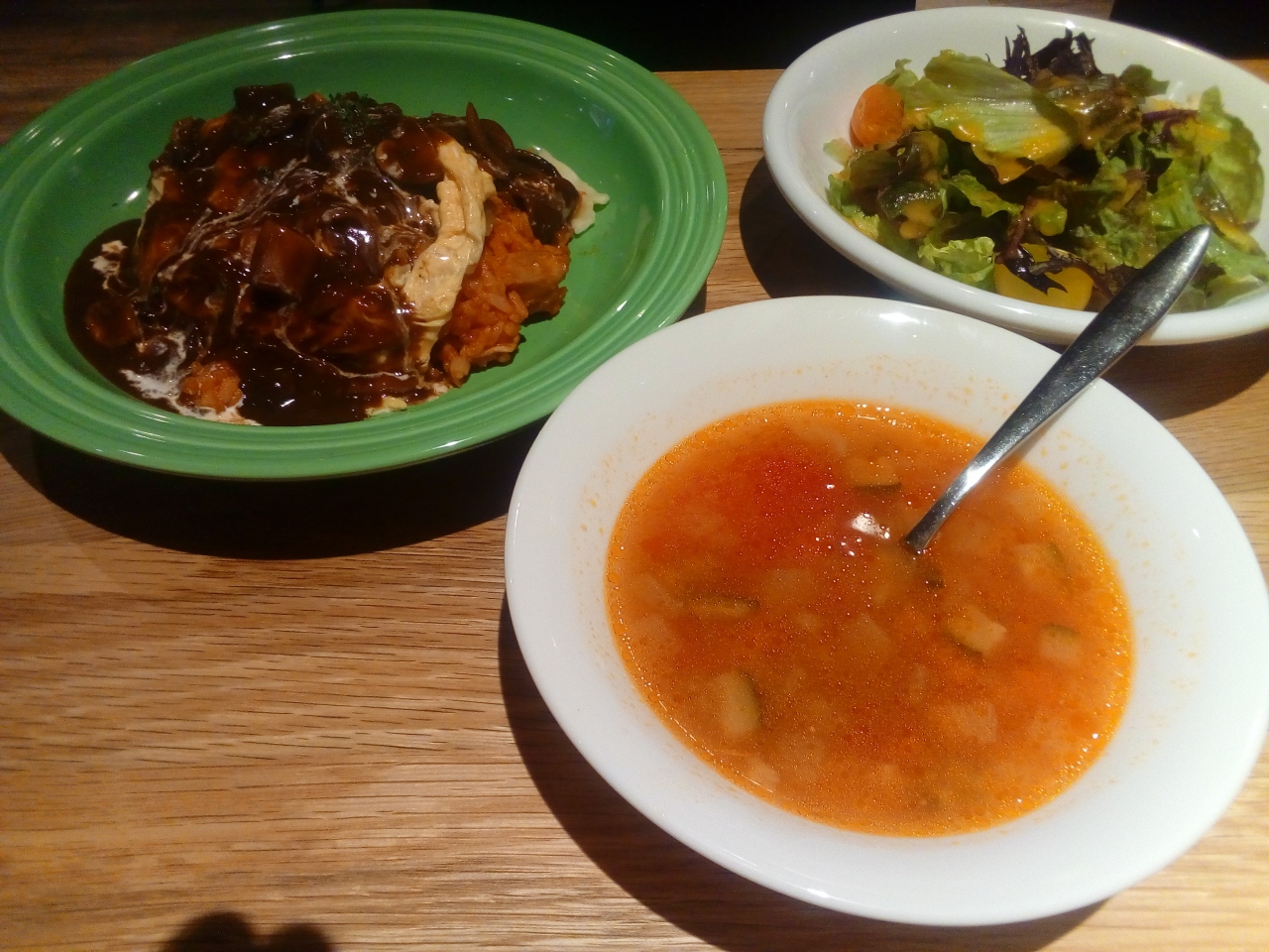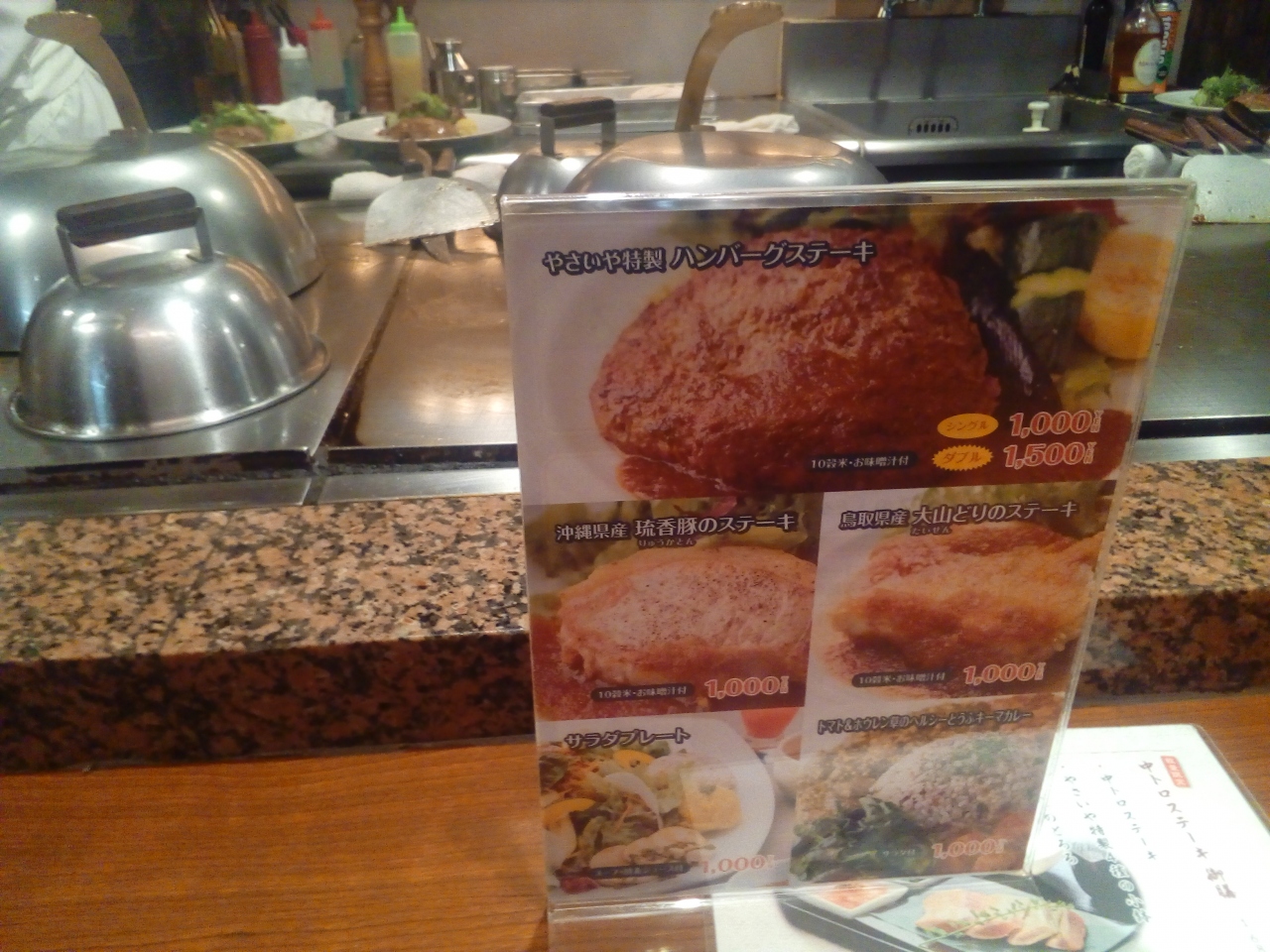 「やさいや」という名前ですが、お料理は鉄板焼きです。ランチには、ハンバーグ、チキンステーキ、ポークステーキがあり、ソースも6~7種類から選ぶことができます。カウンターもあり、シェフの手さばきを見るだけでも楽しいです。そうそう、帰りにコーヒーをテイクアウト(無料)することができます。