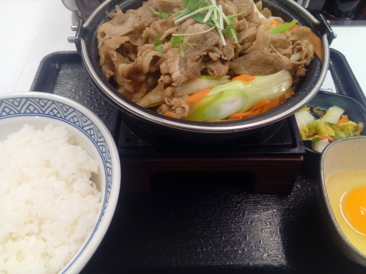赤坂見附の駅から歩いて3分くらいの便利なところにあります。吉野家と言えば、普通は「牛丼」ですが、私は牛鍋定食が好みで、大盛(750円)がお気に入りです。少し待ちますが、出汁の利いた牛肉、野菜、そしてきしめんを卵と併せていただくと幸せな気分になります。