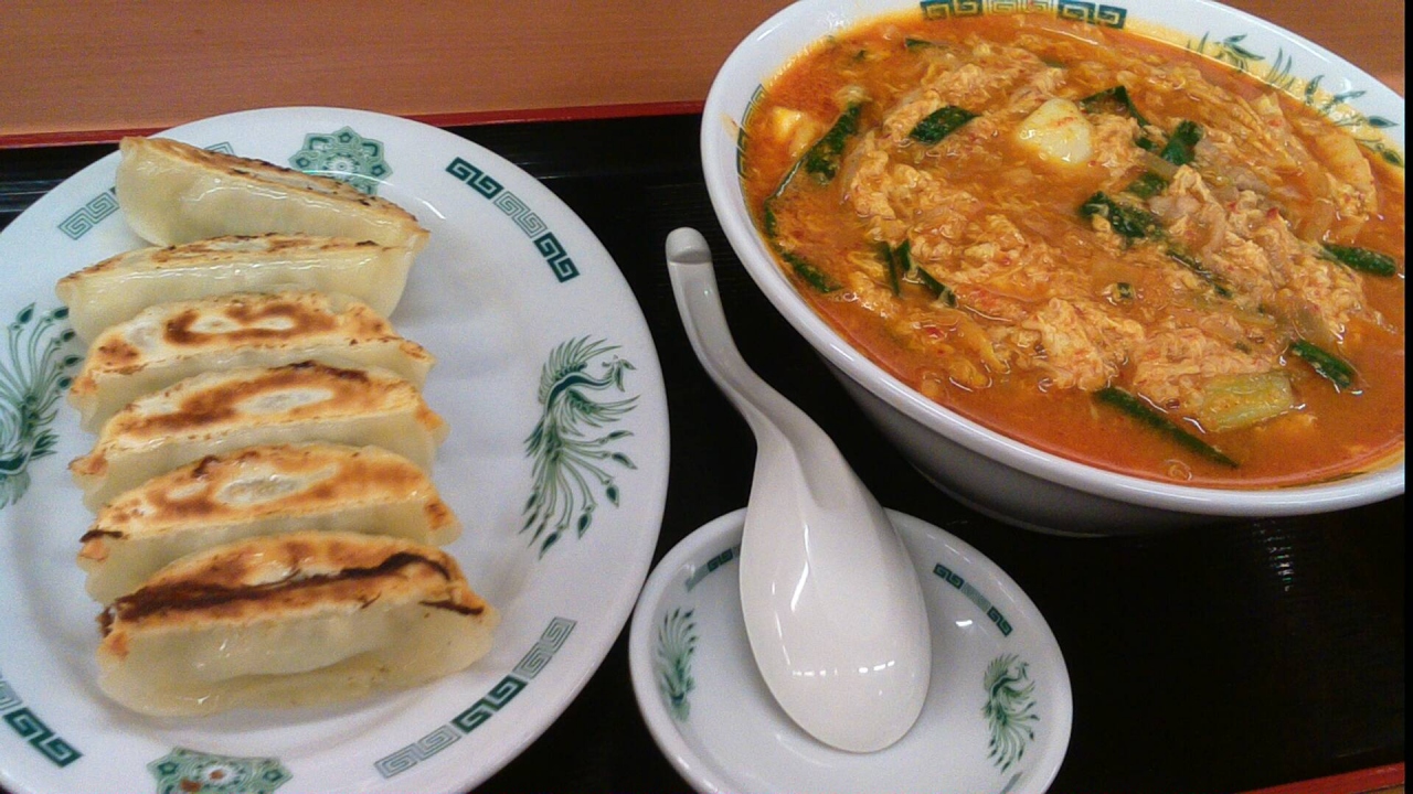 どこにでもあり、お手軽にお安くボリュームのあるご飯をいただけるのが日高屋ですが、この店は、赤羽駅西口からすぐのところにあり、ローソンの隣なのでわかりやすいです。今回は、季節限定のチゲ鍋めんと餃子をいただいてみました。
