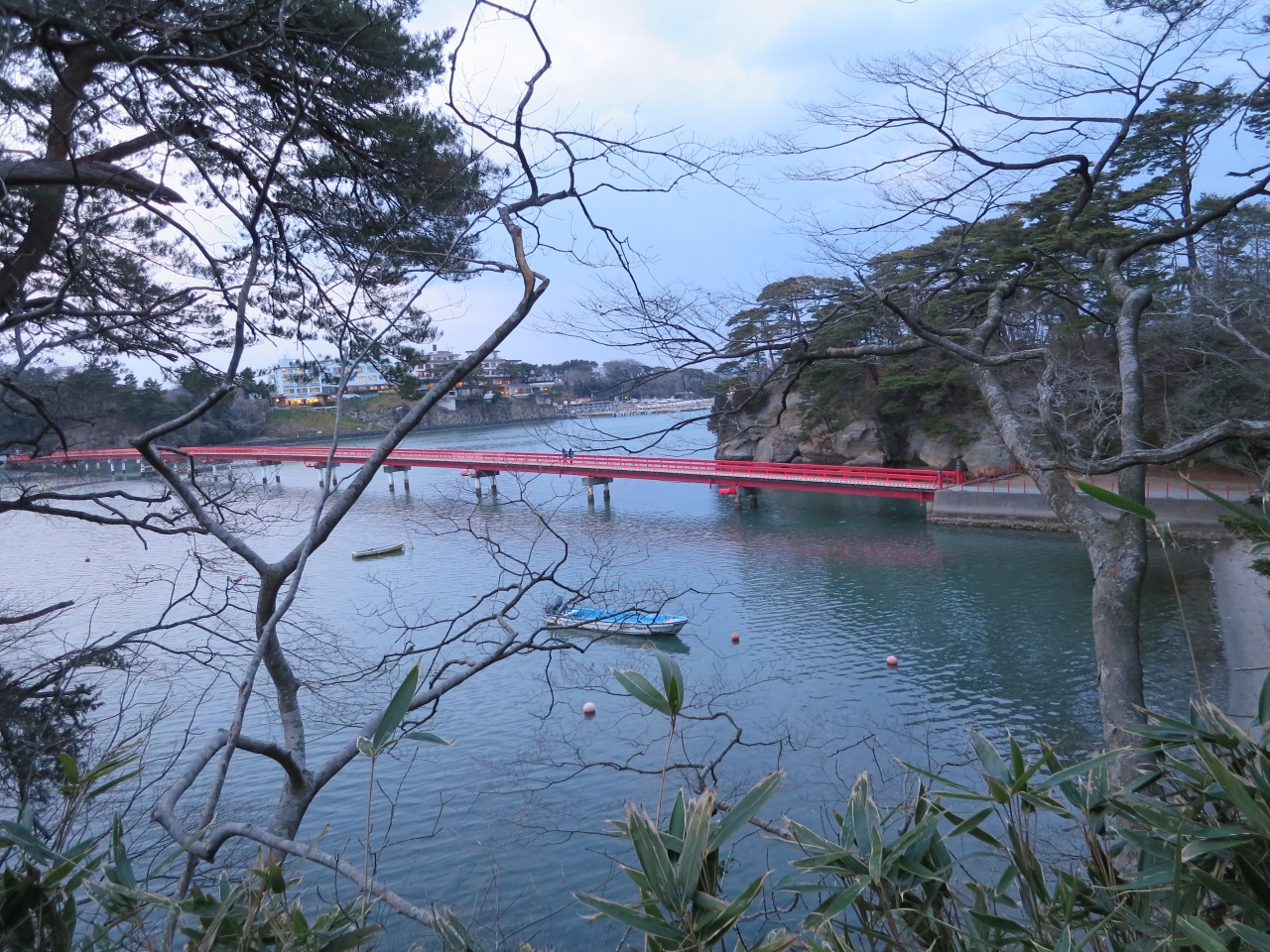 紅色の福浦橋を渡って島に入ります。全体が自然公園になっていて、歩道も整備されており、気持ちよく散歩できます。あずまややら何やら見るものもそれなりにありますが、何よりも、もちろん、ところどころに見える松島の海や島々が一番のごちそうです。時間がなく、終点の見晴らし台に行けなかったのが、残念!