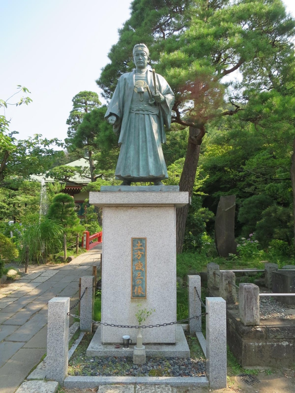 高幡不動の境内、五重塔の手前に立っています。新選組副長の像とお不動様に何の関係があるのかはよくわからないような気もしますが、少なくとも日野市の英雄には違いがないので、観光名所の特等席に位置を占めるのが当然なのかもしれません。宝物館にも写真やらお手紙やらの資料が仏様と並んで展示されていました。