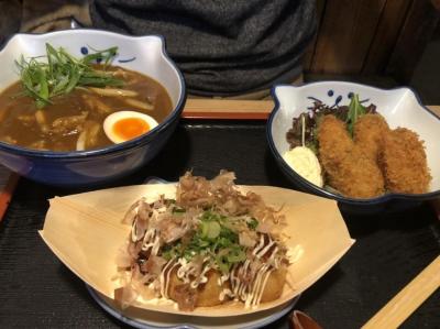 夕食、のらやで頂いたカレーうどん、カキフライ、たこ焼きのセットは凄いボリュウムです。