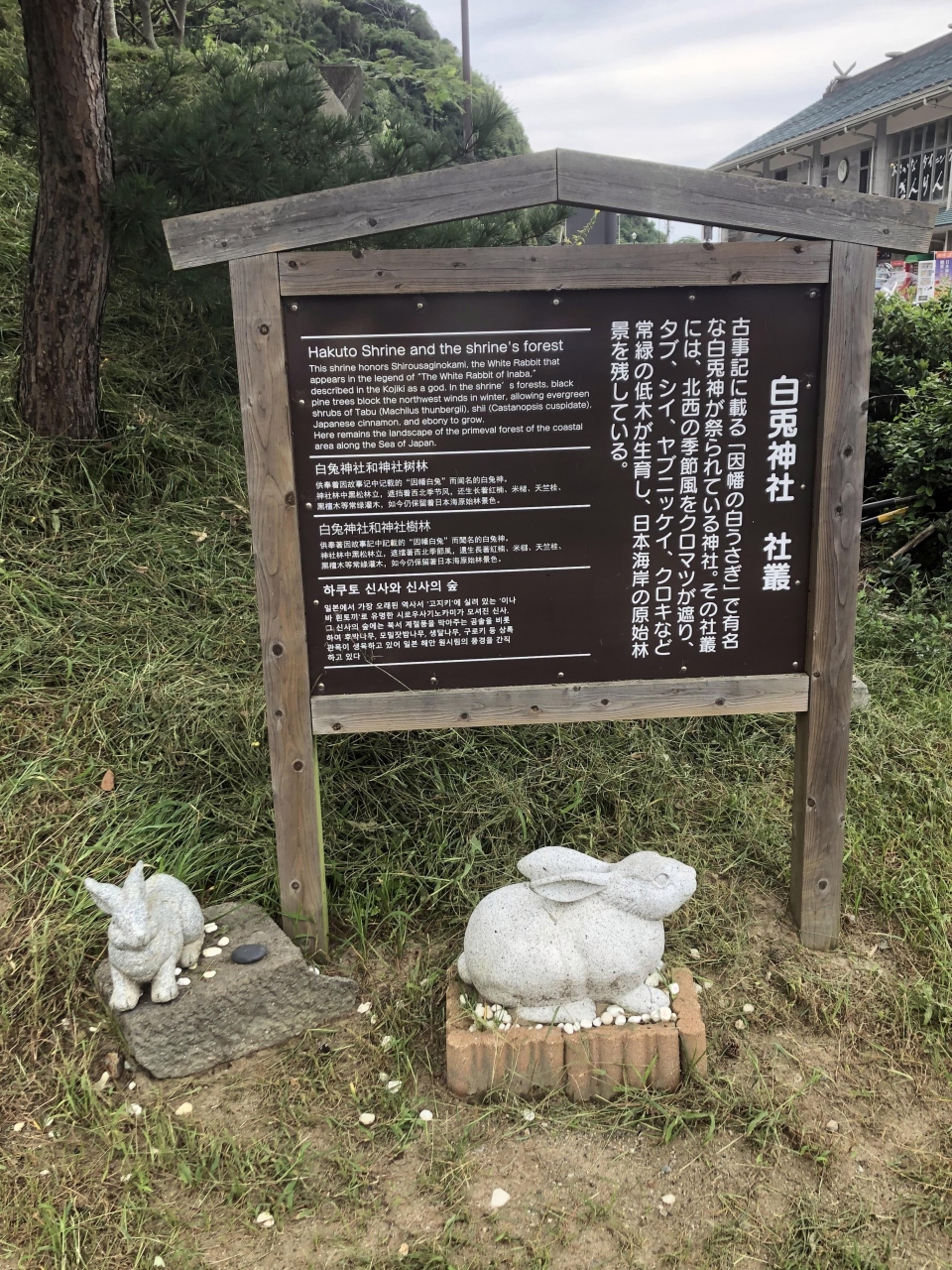 神話は、大国主命が毛皮をはがされたウサギの話を聞いていくところから話が始まります。神社参道には、この神話のように縁結びの神様として、かなわぬ恋をかなえ、特定の人との親交を深めると信仰されています。