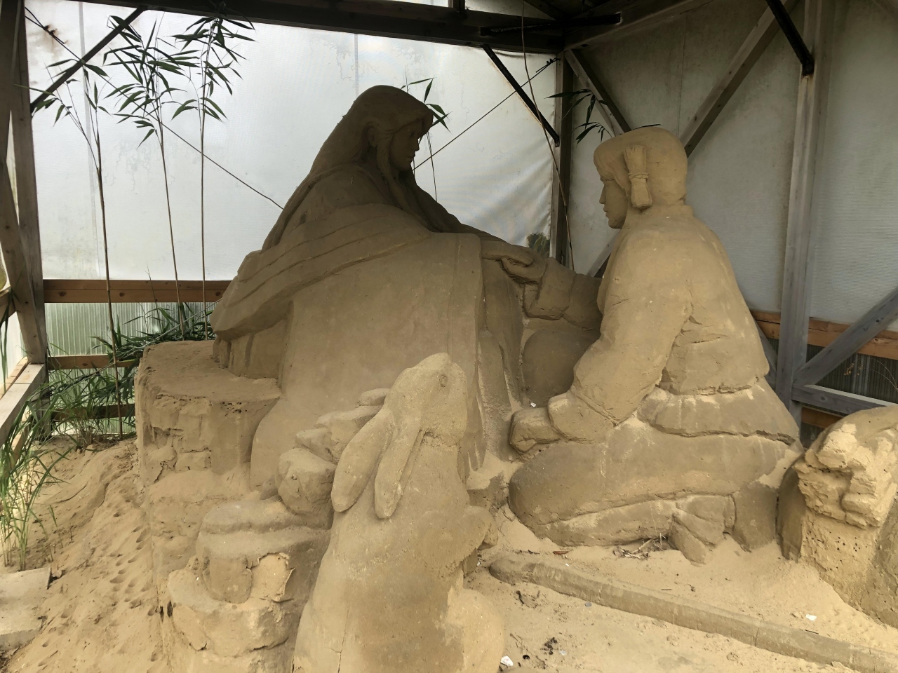 参道には縁を結びの姿が、砂像で表現されています。- 旅行時期