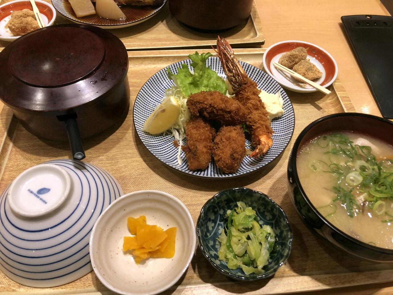 この季節、カキフライに目がなにので「広島産カキフライと有頭海老フライ定食」を注文しました。みそ汁は豚汁に変更もできます。