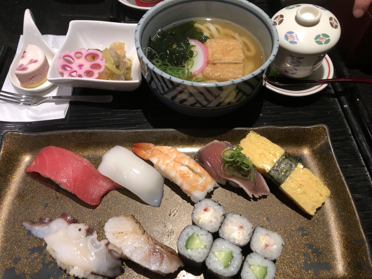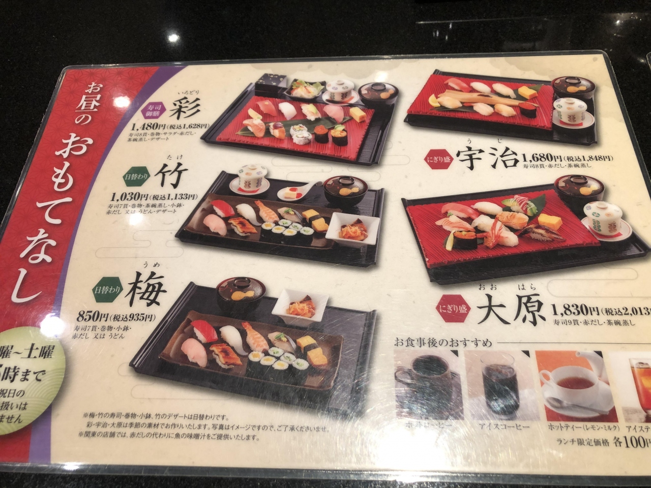 日替わり「竹」には、寿司7貫、巻物、茶碗蒸し、小鉢、汁物又はうどん、デザートで、1,133円(税込)とお得です。