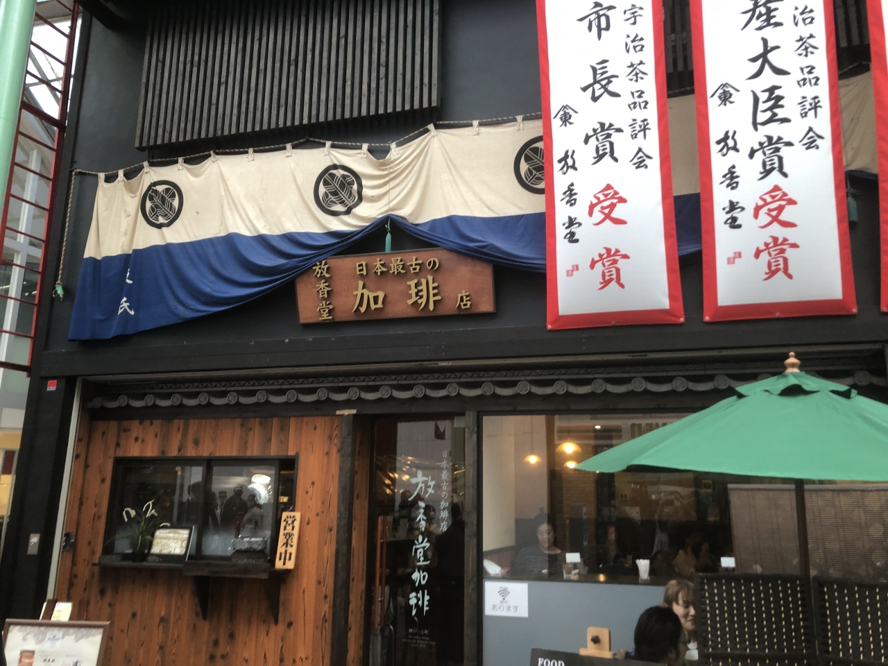 宇治茶の製造・卸で松平家のお抱え商人であった放香堂が、1874年宇治茶の小売り店を開店させ、小売りと並行させて珈琲豆の輸入も手掛け、1878年の讀賣新聞に広告を掲載した記録が残っており、これが「日本で最古の珈琲店」といわれる由来のようです。