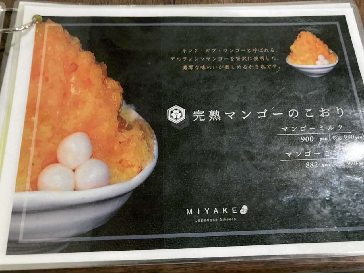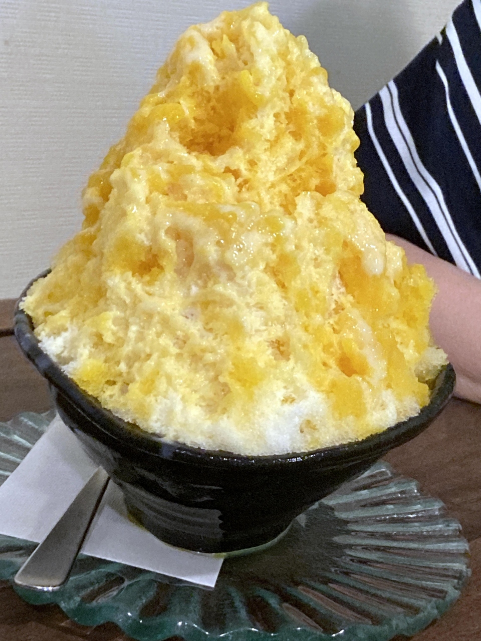 抹茶のかき氷も捨て難いのですが、今回奥様はマンゴーミルクを注文、マンゴーという洋物が、和のかき氷になっていました。