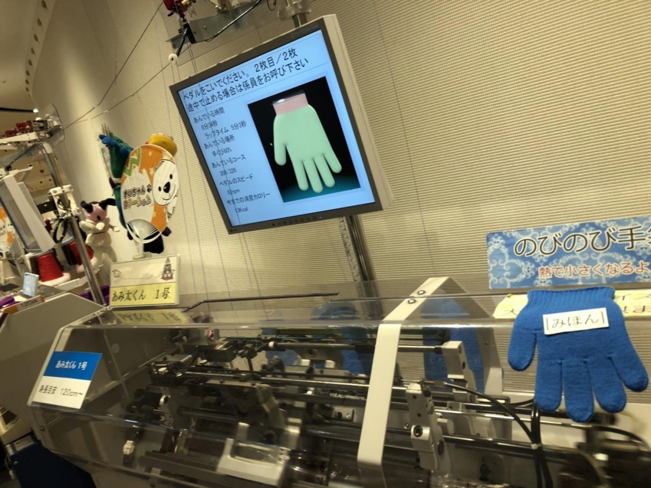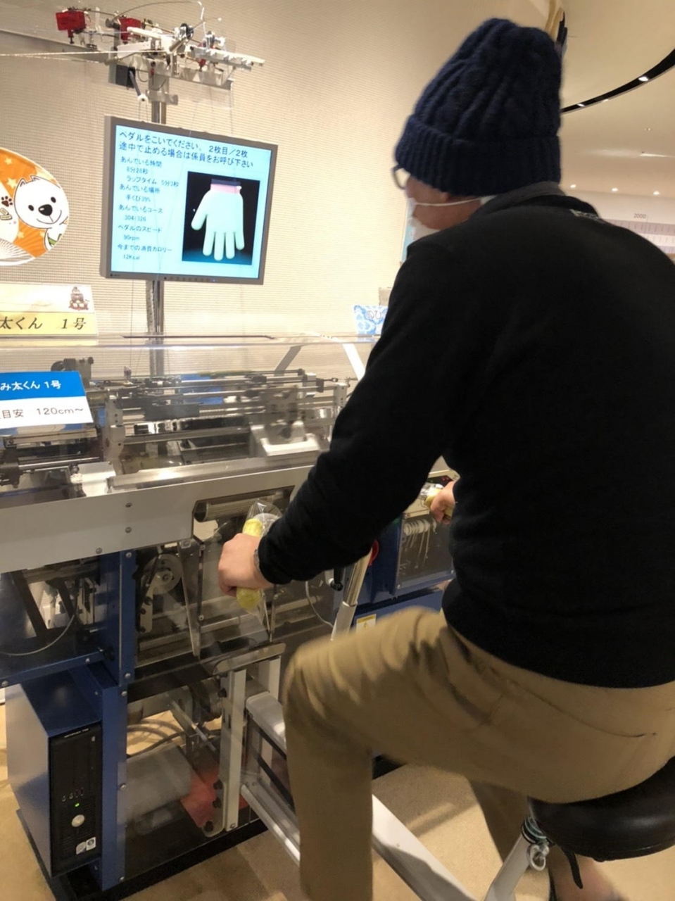 完全無縫製横編機の技術力は素晴らしく、継ぎ目のない手袋を、自転車の動力で作れる、という体験コーナーもありました。