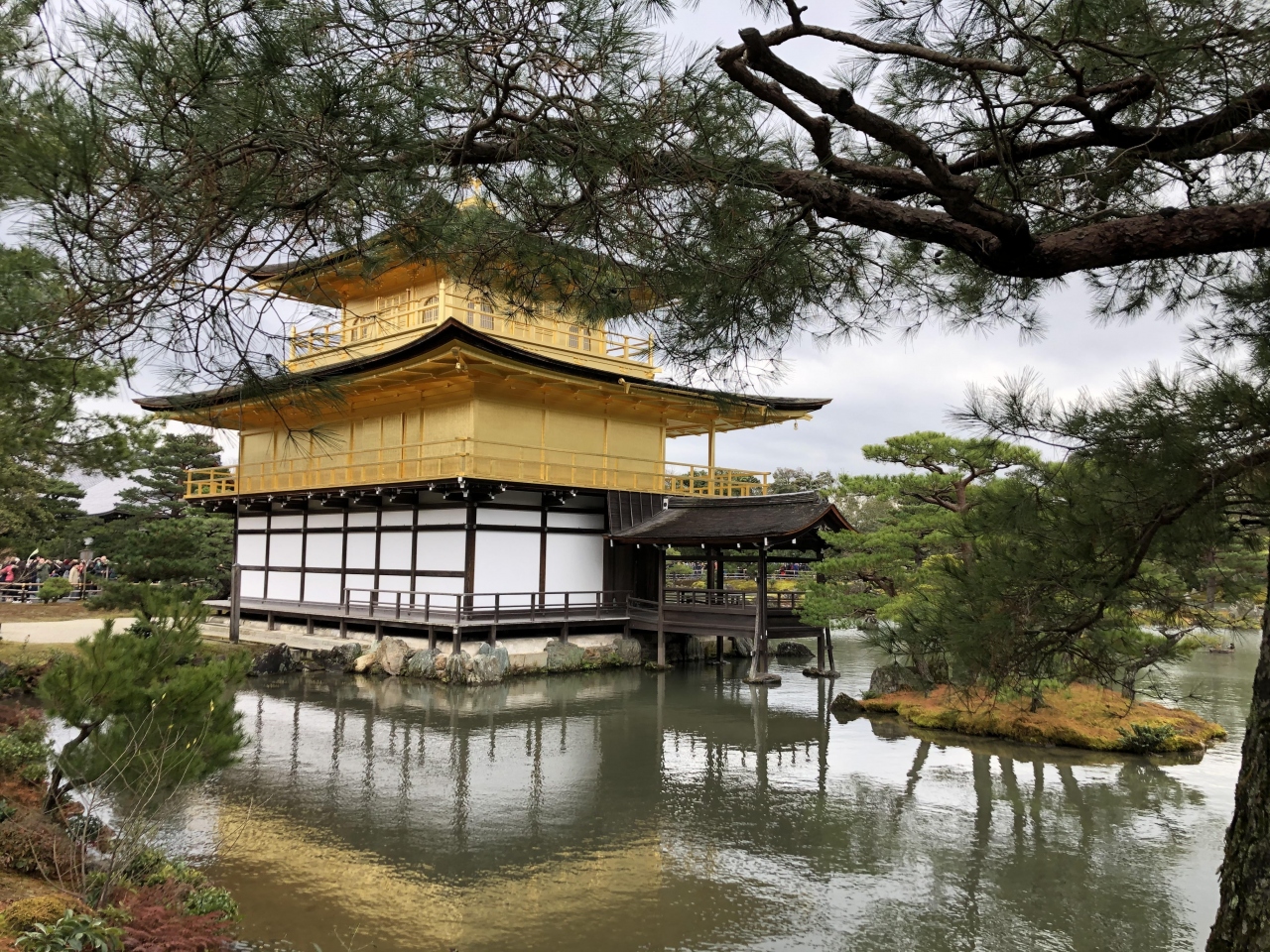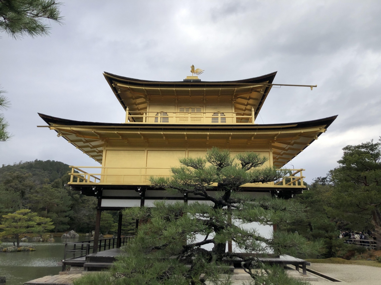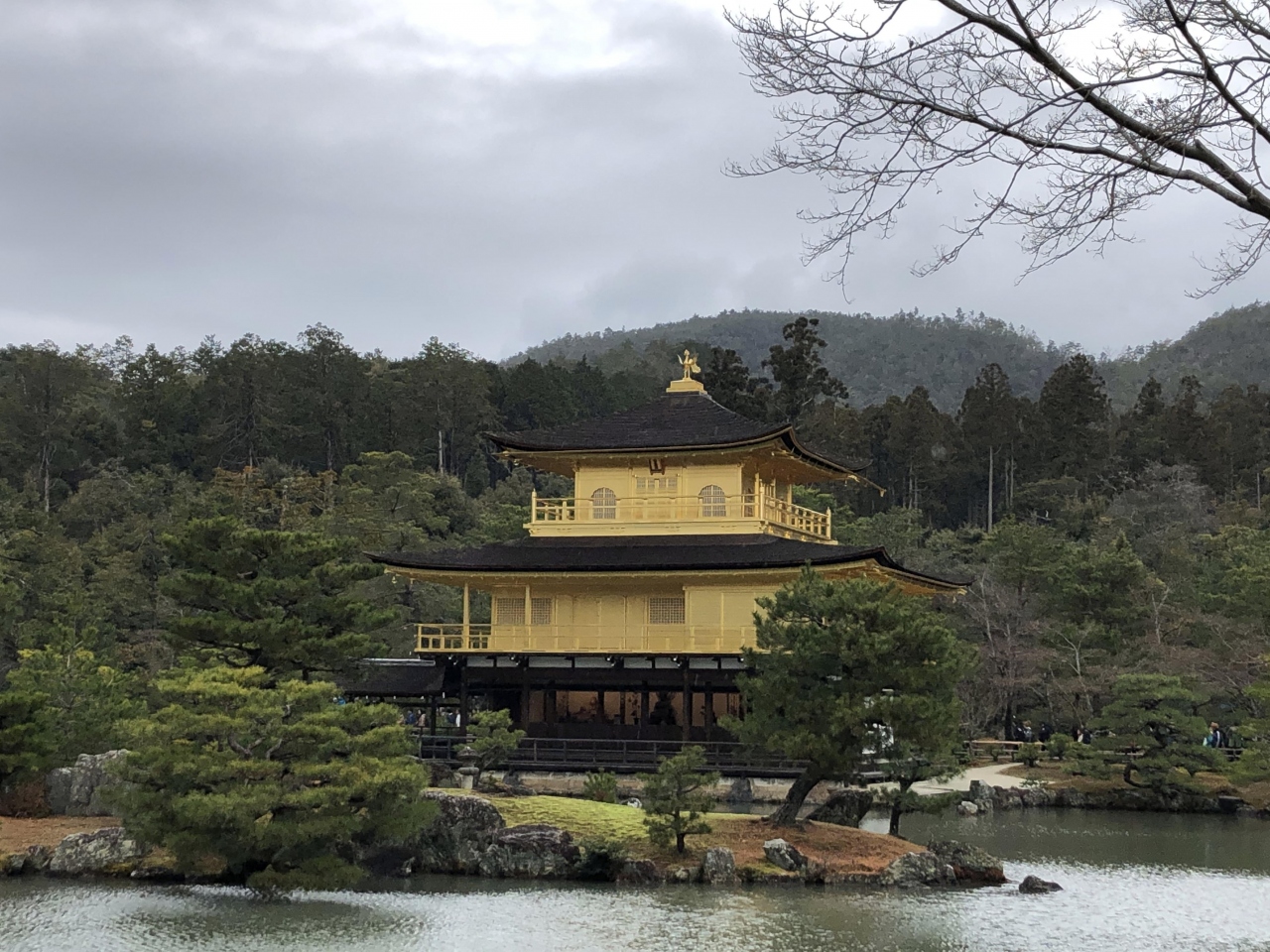 メインは金箔に覆われ、光り輝いている舎利殿を池越しに見る風景だと思います。