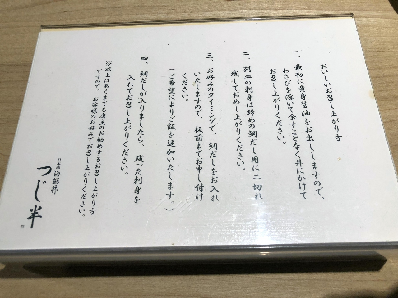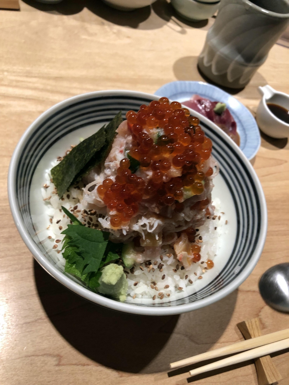 メニューは「ぜいたく丼」のみ、具材は季節によるのでしょうが、まぐろ、中落ち、いか、数の子、胡瓜、つぶ貝、みる貝、ボタン海老、いくら等です。