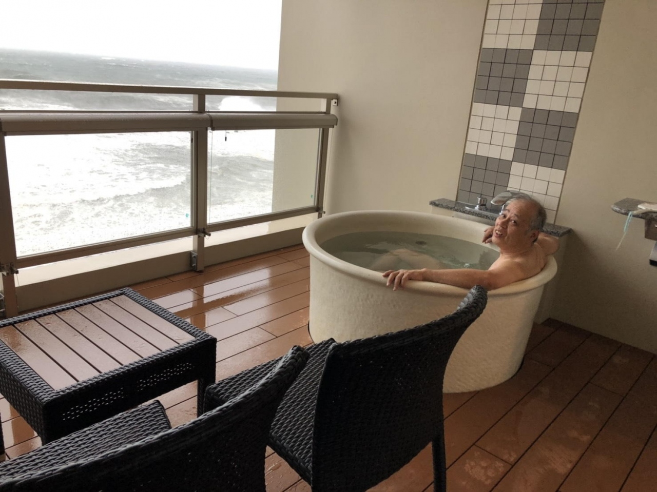 インフィニティ露天風呂で、目の前に障害物なく、水平線に溶け込んでいく感覚は風呂好きにはたまらないですね。