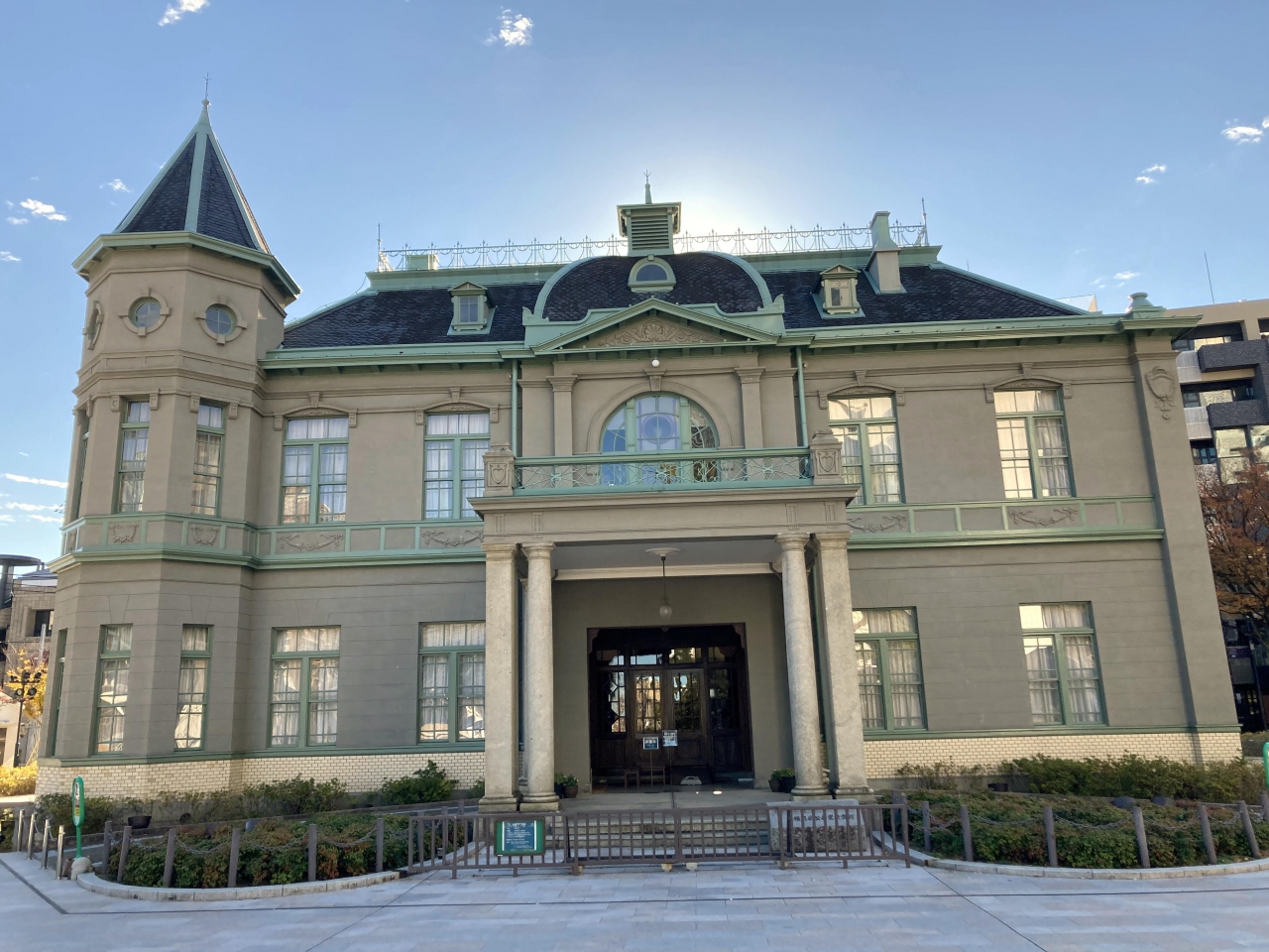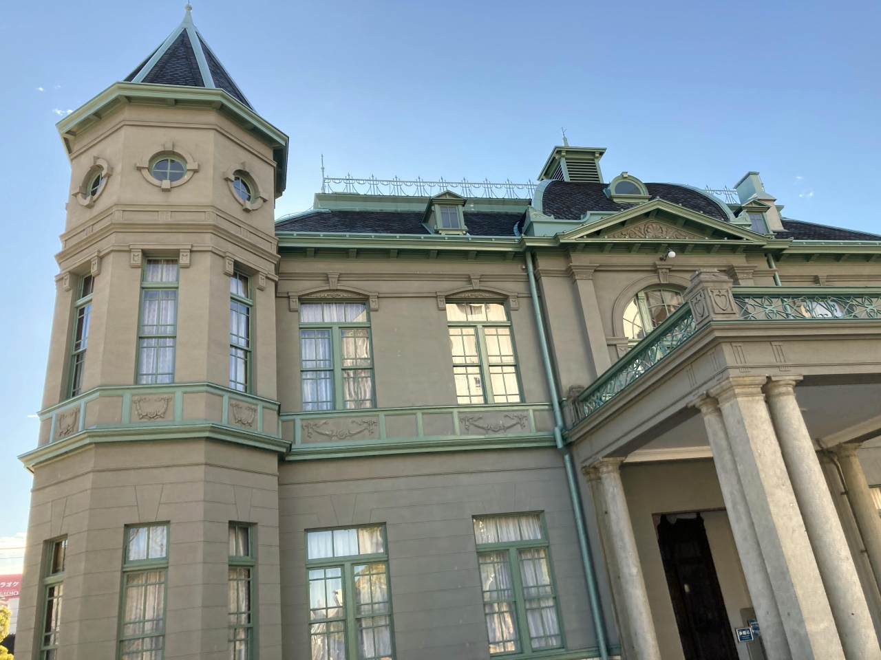 設計は三條栄三郎氏、フレンチルネサンス様式の木造2階建、正面中央に石柱による玄関ポーチが突出したデザインです。