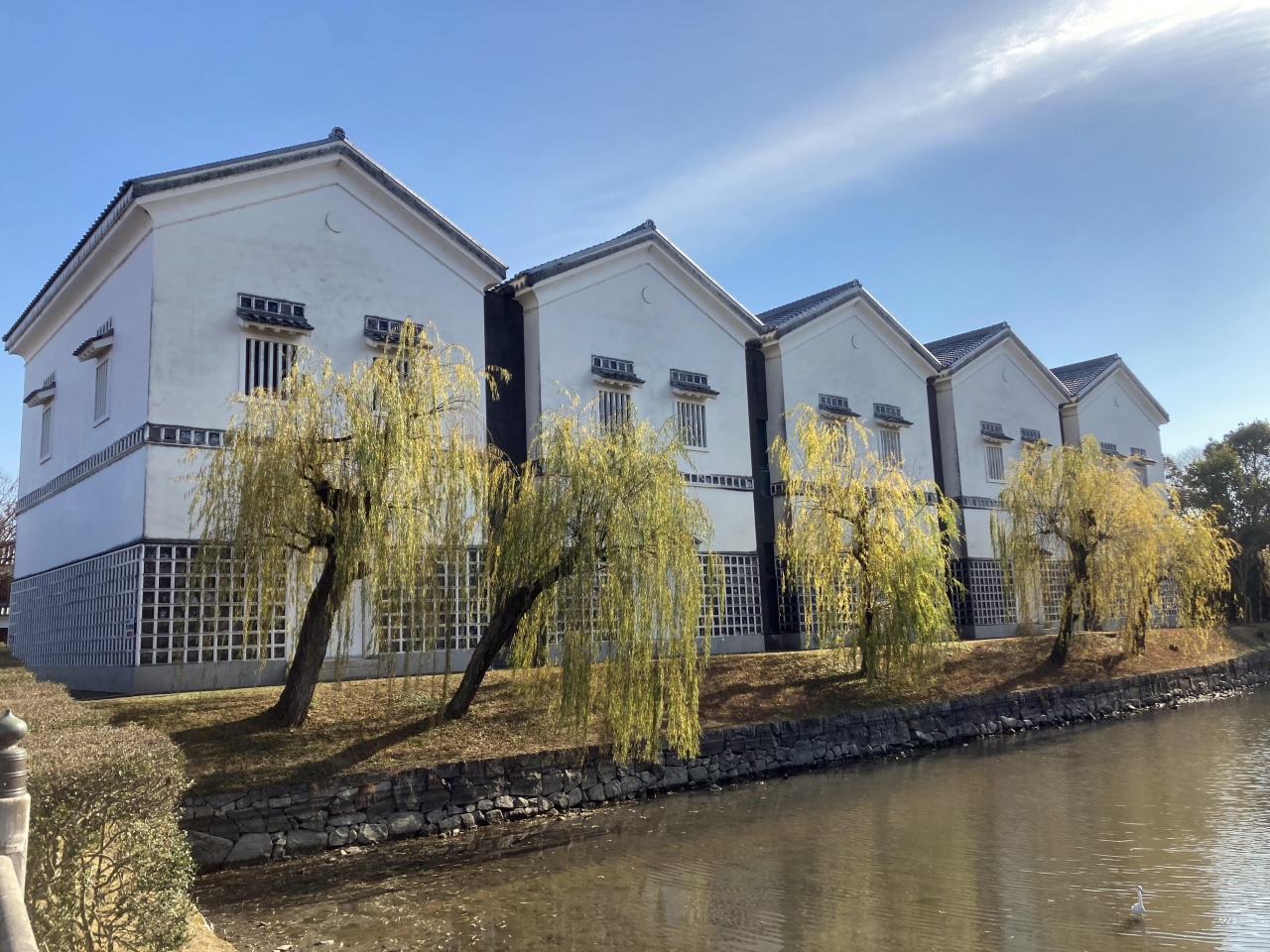 建物の西側外観は、5連の白壁土蔵を模して造られていて、米蔵を再現したデザインとなっています。