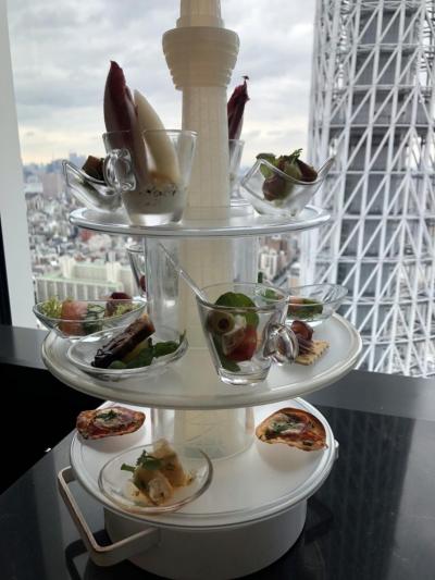 こちらのお店の前菜は、スカイツリーに見立てたタワーが名物で、8種の小さな前菜 アミューズタワーです。- 旅行時期
