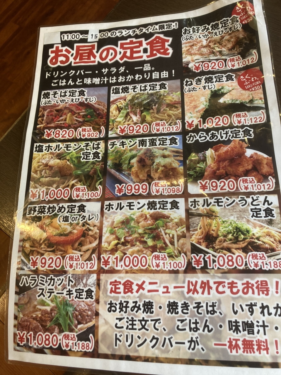 ランチタイムはセット以外でも、ご飯、味噌汁にドリンク付きとなり、お得感が高いです。