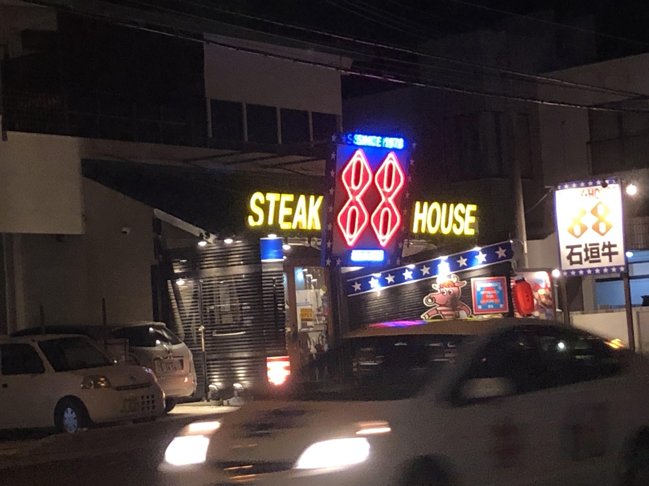 谷茶ベイホテルから車で5分程にある、ステーキハウス88恩納店です。