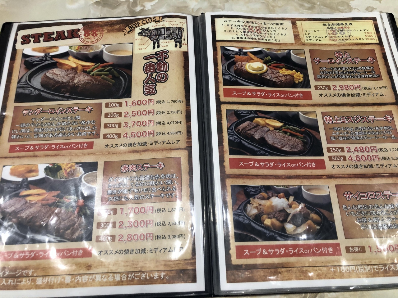 前菜、スープ、サラダに140Gの肉にデザート、ドリンク付きで5,000円以下というのはお得だと思います。