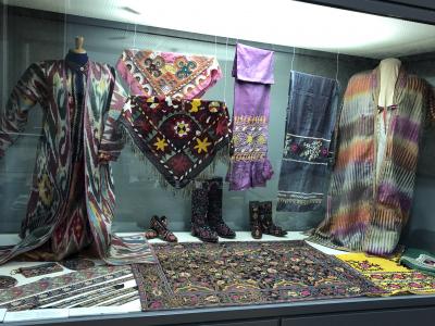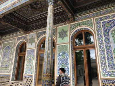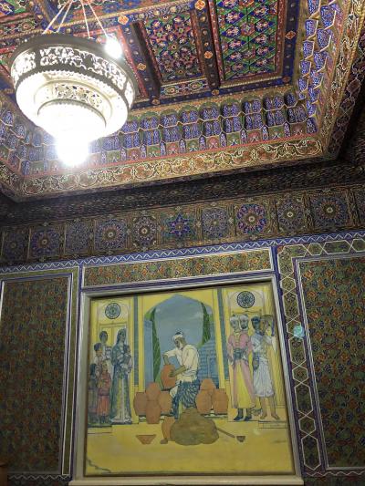 入って最初は、ウズベキスタンらしい、絨毯やスザニが展示されており、それから、この建物の美しい部屋に入ると、その、内装の、壁から天井まで宮殿のような美しさには目を見張ります。細かい装飾の美しいこと!しばらく見とれます。