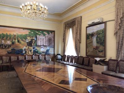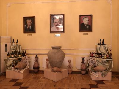 りっぱな建物の中へ入ると、男性二人(おじさんと若いスタッフ)が待っててくれ、何と、貸し切りで、他にお客さんいなくて何だか申し訳ないのだけど、テイスティングやってくださると。案内人おじさんが、最初は、サマルカンドワインの歴史や出来る過程など、展示の品々を見ながら話をしてくれます。