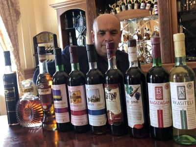 それから、隣の、中のインテリアの素敵なテイスティングルームに行くと、10種類のワインが、グラスに用意されています。ボトルも並んでいて、さらっと説明を受けいよいよ試飲。その前に、おじさんが何枚か写真を撮ってくれる。それから試飲。最初は、一本白。それから、赤が六本、最後の三本はコニャックと、アルコール度と値段も高くなっていくよ、と、一本一本ワインの説明をしてくれ、試飲が進みます。ほんの、2、3口で、味わいながらいただき、最後のコニャックはさすがにちょっとゆっくりいただき、軽快に飲み終わりました。ウズベキスタンの赤ワインは、どれも甘め。ウズベキスタンの人たちは甘いのが好きなんだと。それから、また、おじさんが何枚か写真を撮ってくれ、テイスティング終了。ボッ~とすることもなく、その後、ボッ~としてくることもなく・・、アルコール度高いのがあっても、ほんの2、3口なので、お酒OKの人なら、酔っぱらったりする心配はないのでは、と思います。