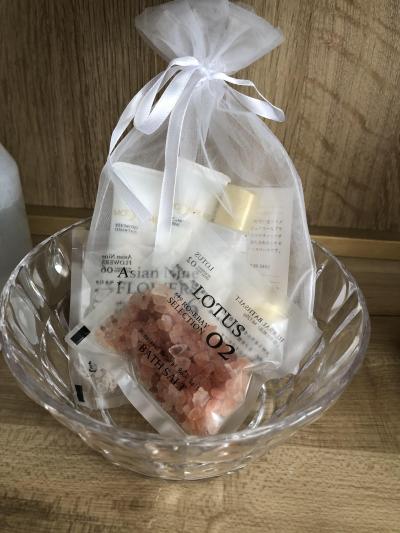 部屋には、ソファースペースに大きなテレビ、お茶セット、冷蔵庫には無料でいただける飲み物も入っていて、また、クローゼットを開けると、今治タオルのパジャマが、ゆったりサイズ、ぴったりサイズでそれぞれ人数分用意され、やはり今治タオルのふかふかのスリッパは持ち帰りも出来ます。洗面所にも、ロクシタンのアメニティに、奥には、広い、テレビ付きの温泉!至れり尽くせりです。