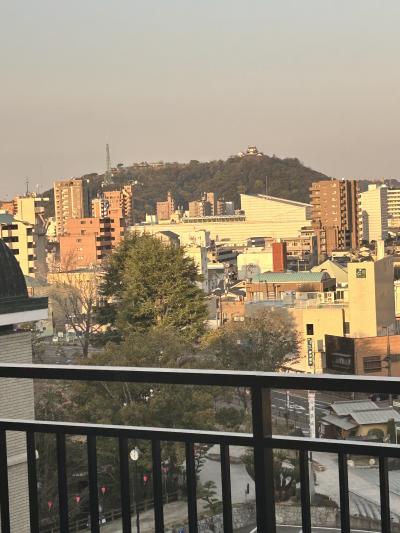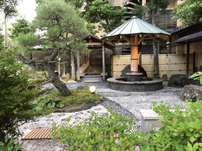 部屋のお風呂は、小さい障子を閉めたり開けたりで外を眺められます。その外は、ベランダから眺めても道後の喧騒が全く感じられず、どこか信州にでも来たんだっけな、と思わせるような立派な木々が伸びた緑の庭が広がってます。