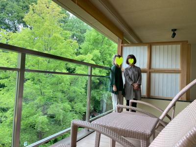 部屋へ行く渡り廊下は、広い緑あふれる庭を眺めながらで、どこか山の旅館に来たかのようです。こんな広いお庭があるのは知りませんでした。降りてゆっくり散策もしました。