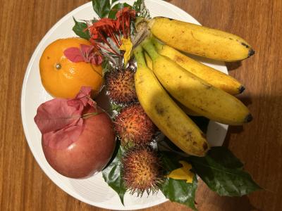 部屋は広くて快適、到着時にはフルーツ盛りが置かれてました。