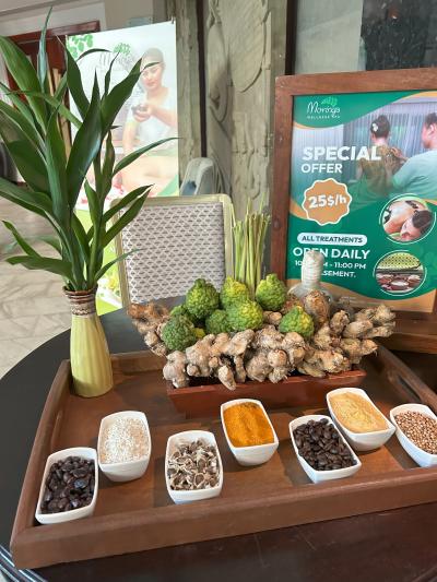 レストランでは毎朝食食べたけど、品数はあまり多くなく、工夫がない感じ。一度、ディナーで、カンボジア郷土料理セットも食べたけど、こちらも物足りない感じでした。せっかく、素敵なホテルとスタッフなのにもったいない。