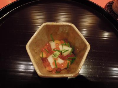 まず最初に出てきたのは、海老(一番下で見えません)と柿とラフランスといくらにネギとワサビを載せたもの。