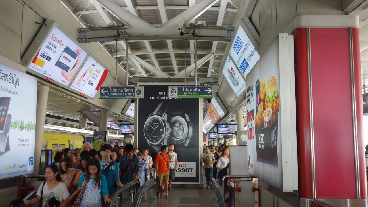 BTS のシーロム線とスクムウィット駅が、乗り入れる駅です。当然ながら一大繁華街で、ショッピングゾーンです。乗降客も繁華街ならではの多さで、圧倒されるかもしれませんが、落ち着いて行動すれば何の問題もアリマセン。