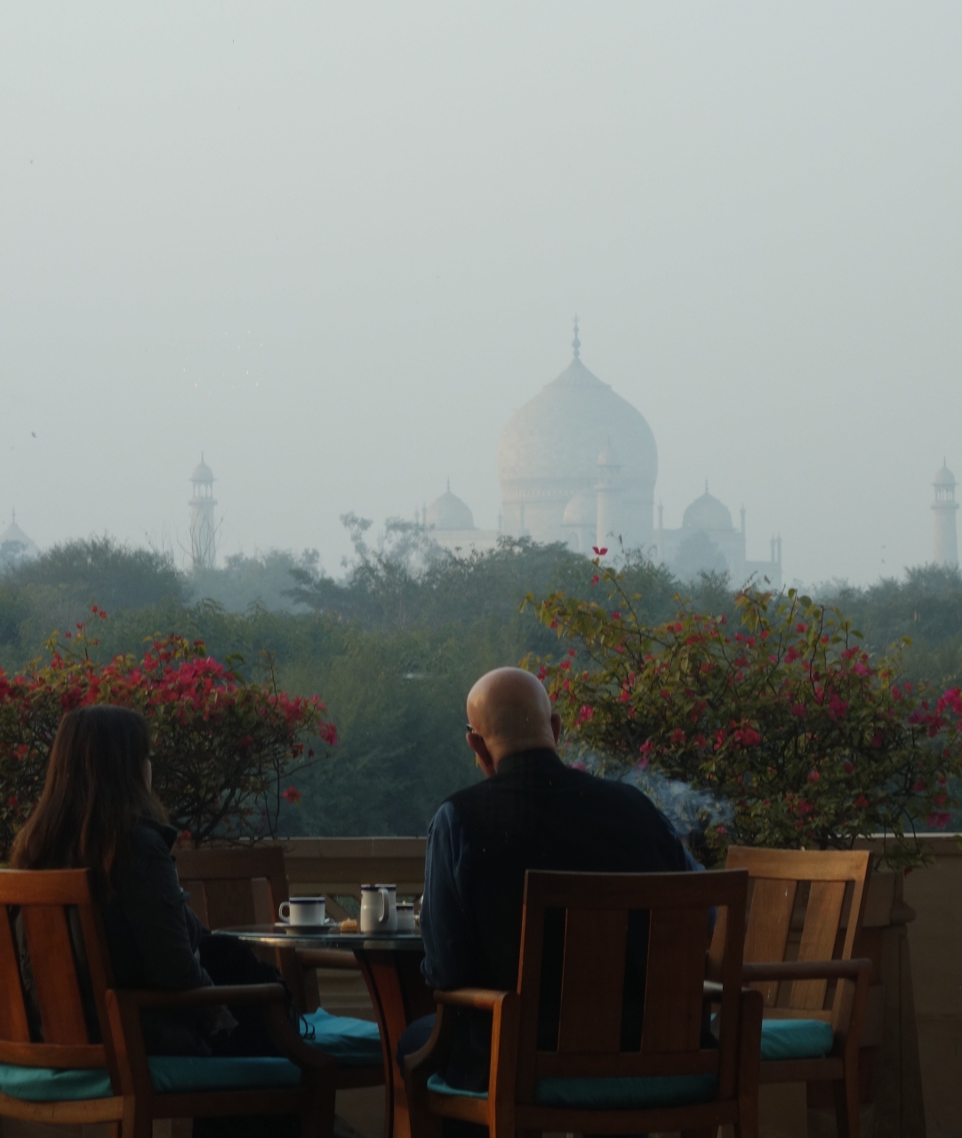アグラ観光の目的を果たしデリーに戻る列車までの時間、このホテルのティーラウンジでマッタリ過ごしました。オートリキシャにて向かいましたが、リキシャは門から先へは入れず歩いてロビーに向かいました。ロビーを抜けるとティーラウンジその向こうに中庭とプール、そしてその向こうにタージマハルが見えます。ラウンジのベランダからの眺めは、この世の楽園としか思えませんでした。