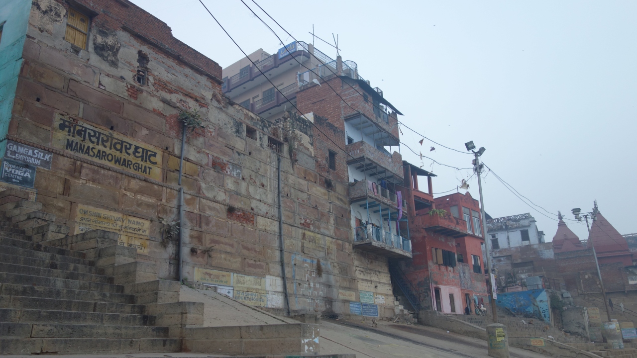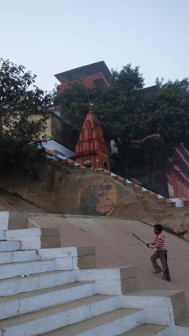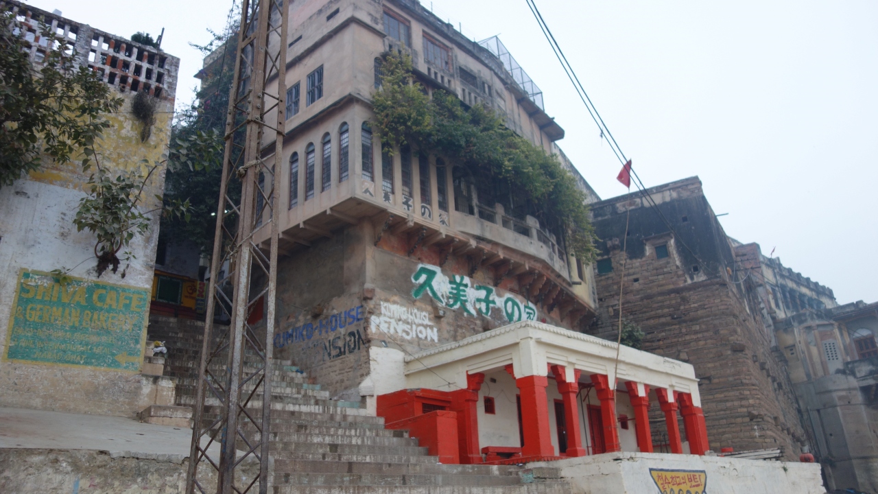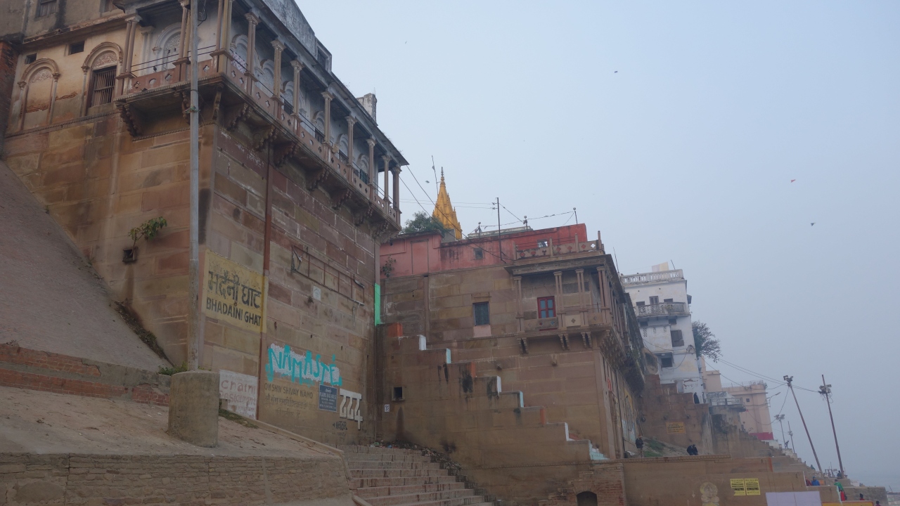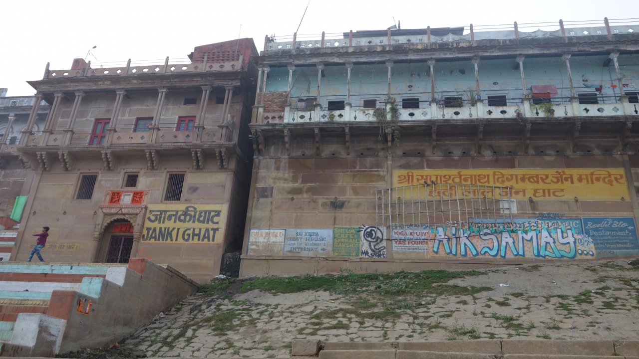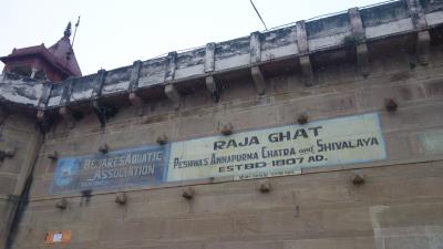 このガートは、クリーム色のテラスが綺麗で思い出に残っています。全体を見渡すと小汚い印象のバラナシのガートですが、個々は中々カラフルで楽しい印象です。クリーム色のテラスに、ブルーのヒンディー語の文字が鮮やかです。