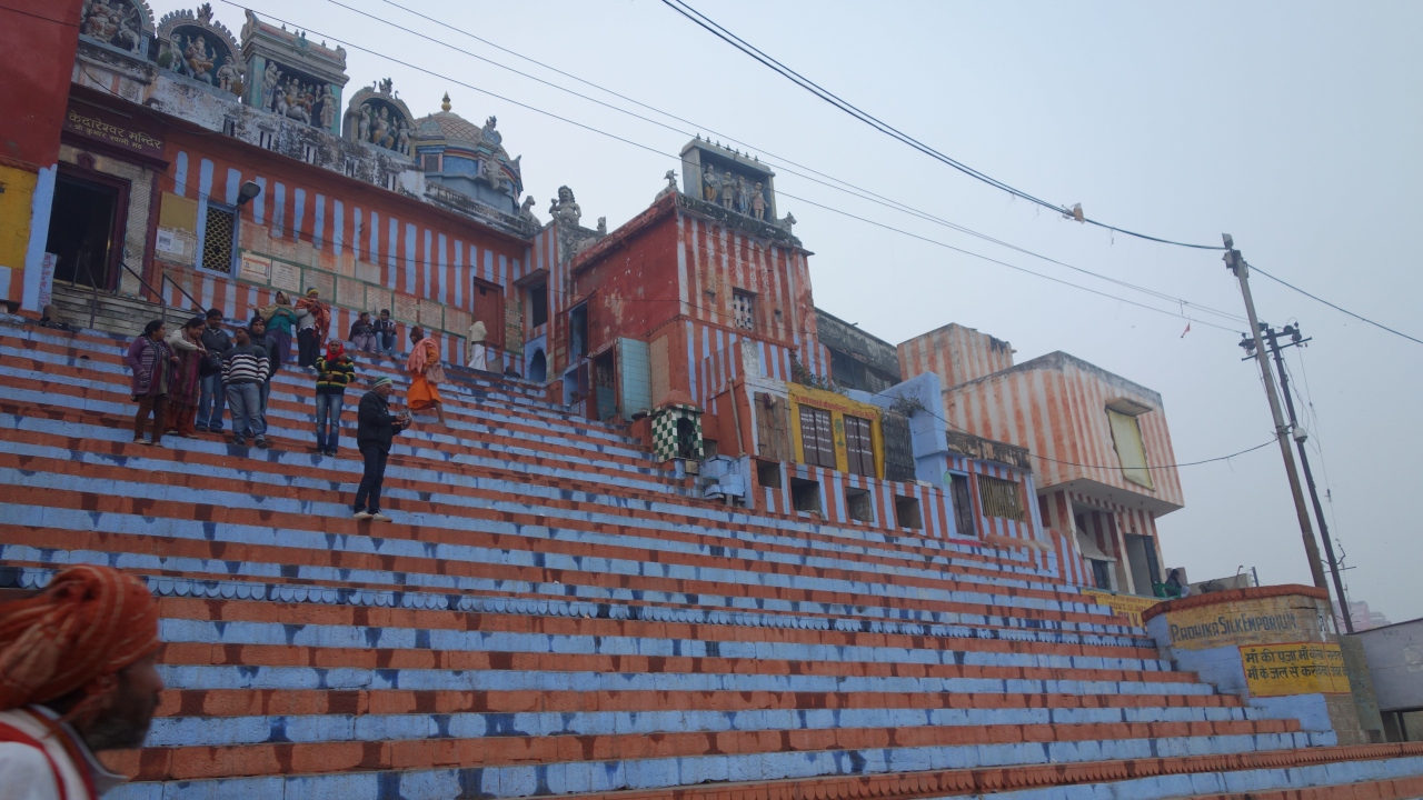 非常に大きな階段が在る、ガート。大きなガートには、沢山の人々が団らんしているので私達ツーリストが佇んでいても、目立たなく安心して休めると思います。残念なのはガートの上に見える素晴らしい彫刻の寺院を見学してこなかった事です。