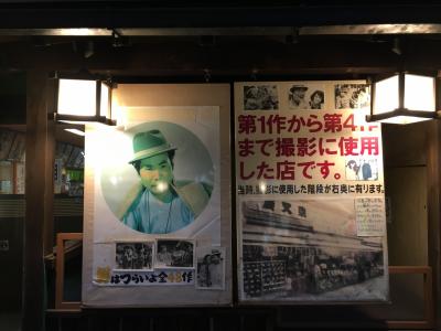 柴又といえば寅さん。草だんごで有名な高木屋さんの店先にて。