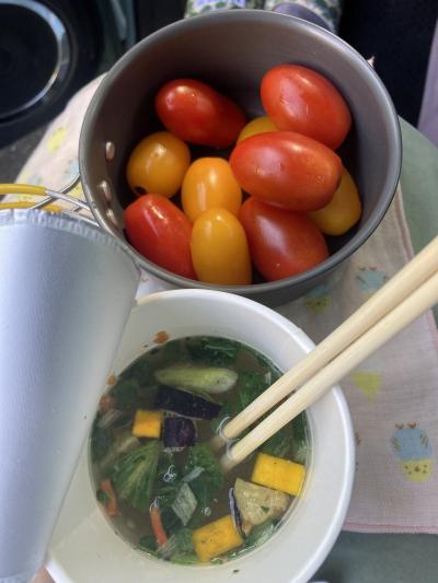 昨日道の駅で買ったミニトマトとインスタント味噌汁の朝食。フレッシュなミ...
