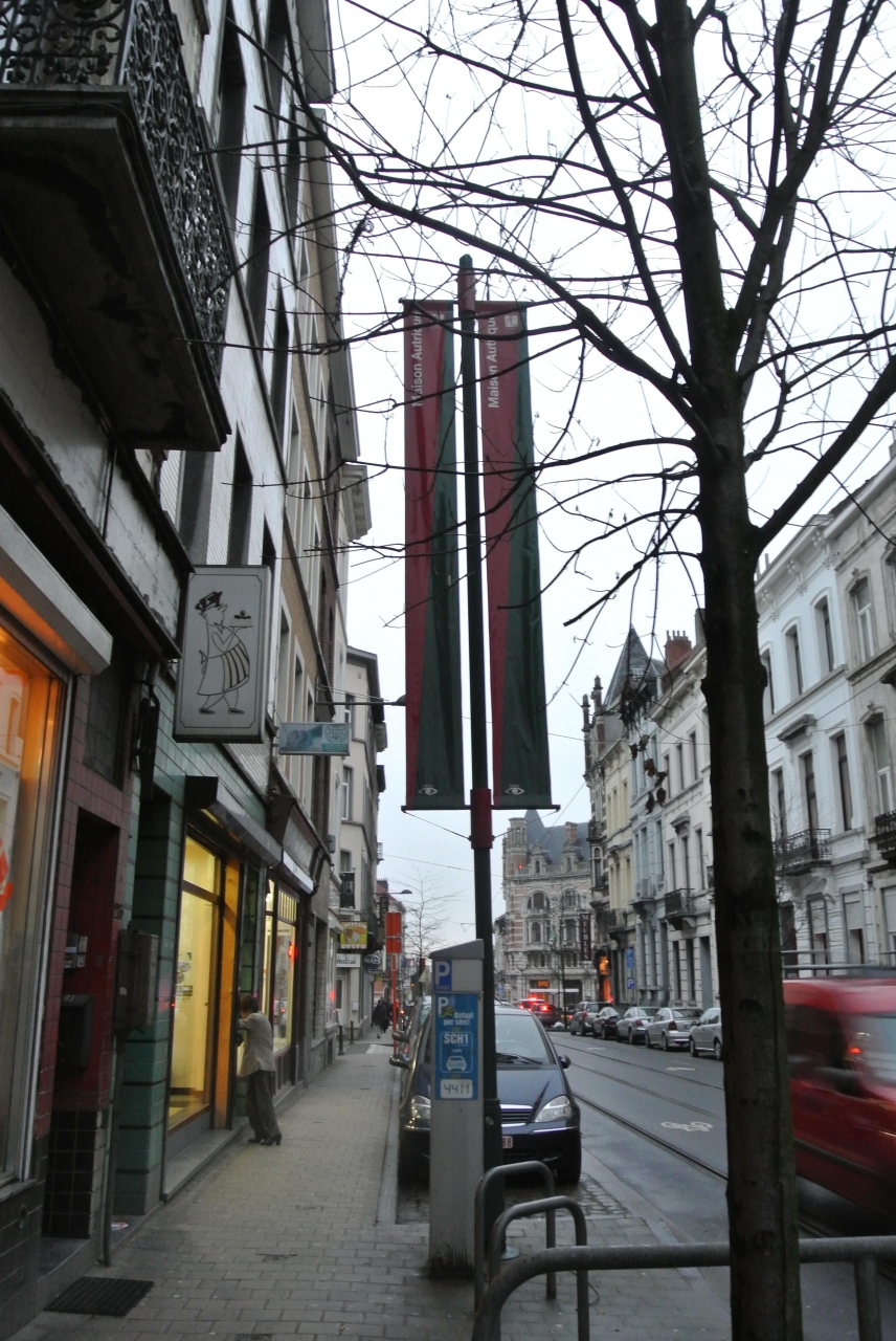 ブラッセルズ・カードで無料の建物になっていたので、オルタ邸ではなくこちらの建物を見ようということでトラムに乗ってSaint-Servaisで降りました。場所はグーグルマップで確認していたのでその付近に歩いていったのですが、それらしき建物が見当たりません。よく見ると旗が立っていたので旗の前に行きましたが建物はどう見てもオートリック邸らしくありません。建物の写真を片手に周りをきょろきょろ見たら道路を隔てたところに、目当ての建物がありました。