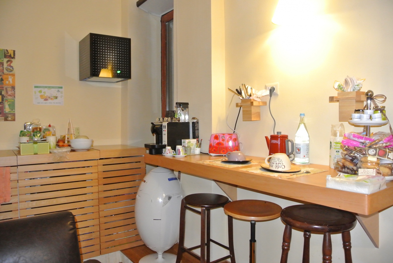 キッチンが使えるので簡単な料理を作ることもできますが、用具があまり揃っていない感じがしました。共有のリビングはいつでも使えて、エスプレッソも飲むことができます。冷蔵庫の中の物は追加料金なしに自由に使えます(部屋の中にもあります)。