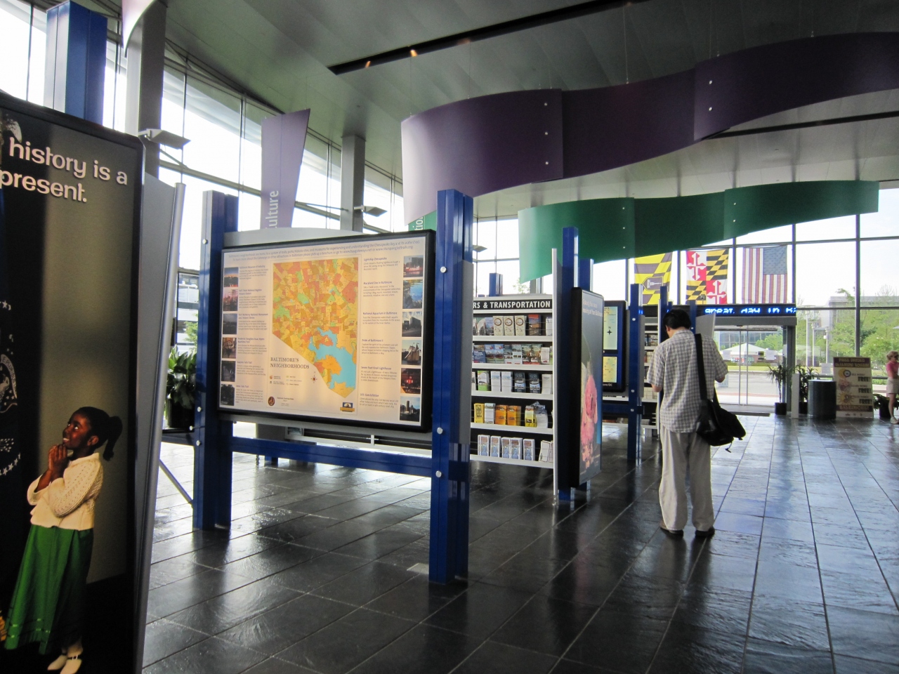 中にはボルチモアやメリーランド州のレストラン、観光スポットなどのパンフレットやリーフレットがずらりと並んでいます。市内の地図もここで手に入ります。観光ビデオを流している部屋もあり、しばし見入ってしまいました。ここで何か特別なことをしたわけでもないし、されたわけでもないのですが、なぜか手厚くもてなしてくれている感じがして気分が高揚しました。